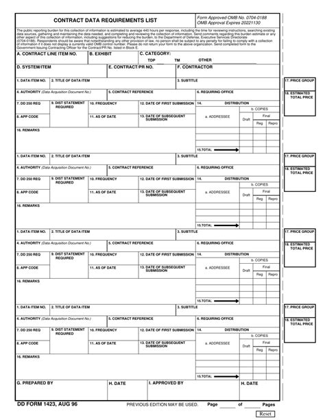 If a dd1423 is used to track contract delivery requirements, it is referred to as a type cdrl (contract data requirements list). Click the image for a larger view « previous | next » To obtain hard copies of current forms not available in electronic format, please contact your own military service or dod component forms management officer. The documents below are example cdrls for properly placing cost and software data reporting on contract. Web the contract data requirements list (cdrl) is a list of authorized data requirements for a specific procurement that forms part of a contract. It’s part of a contract issued by the united states military. Web the department of defense (dod) forms management program is administered by the directives division (dd), executive services directorate, washington headquarters services. This manual is a very good reference! This is the most commonly used cdrl form. It comprises either a single dd form 1423, or a series of dd forms 1423 containing data requirements and delivery information.