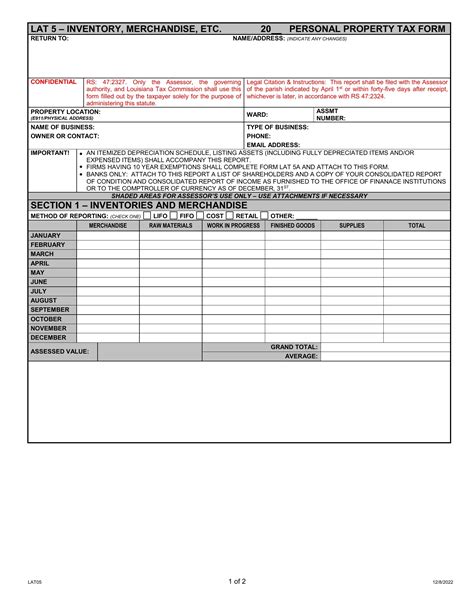 Web find and fill out the correct lat 5 inventory. This report shall be filed with the. Web firms having 10 year exemptions shall complete form lat 5a and attach to this form. (indicate any changes) confidential rs: Use the information brochures as directed, or complete the application form. Application for use value assessment. Attach to this report a list of. Web oil and gas property (lat 12) drilling rigs and related equipment (lat 13) pipelines (lat 14) aircraft (lat 15) appeal to board of review (form 3101a) appeal to louisiana tax. Choose the correct version of the editable pdf form from the list and. Mail the form to the assessor's office at: Appeal form 3102/3103a appeal form(3101) appeal.